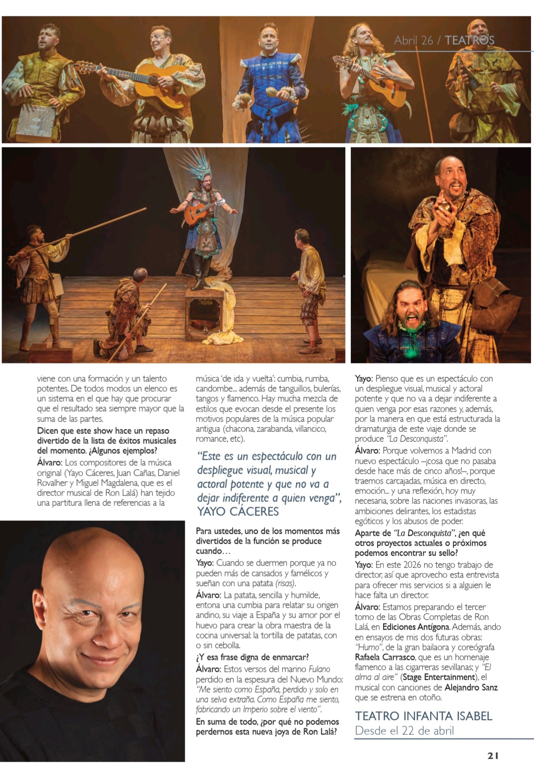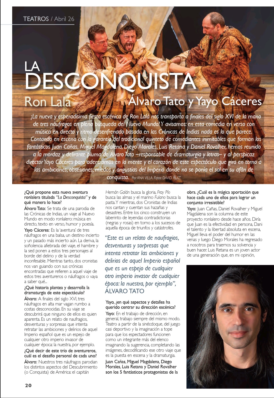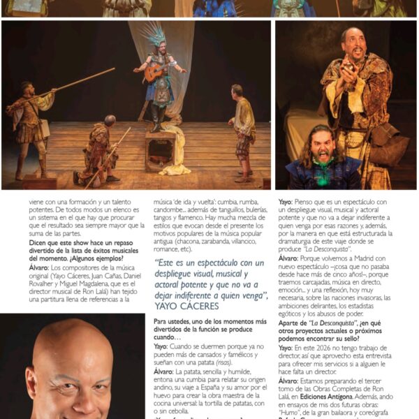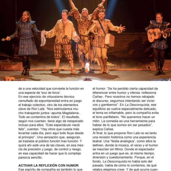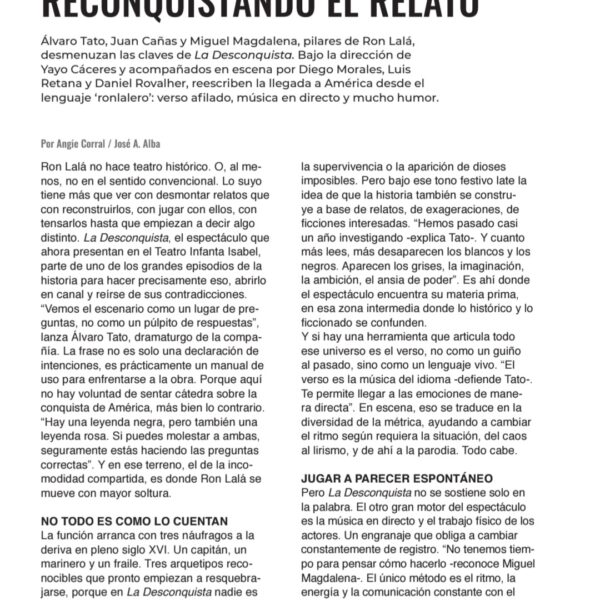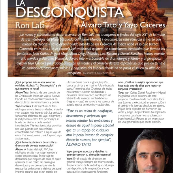 Una fiesta escénica y musical que gira en torno a las ambiciones, obsesiones, miedos y angustias del Imperio donde no se ponía el sol, en su afán de conquista y en su pasmo ante la nueva realidad de un continente aún desconocido. Una visión mordaz y delirante con textos y música originales, humor vertiginoso, poesía escénica y un quinteto de comediantes inimitables. ¡Ron Lalá se lanza a la Desconquista!